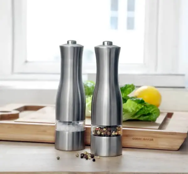 Stilrent elektrisk kværnsæt fra Cook & Baker, gør det nemt at dosere salt og peber på maden og fremstår elegant på bordet.