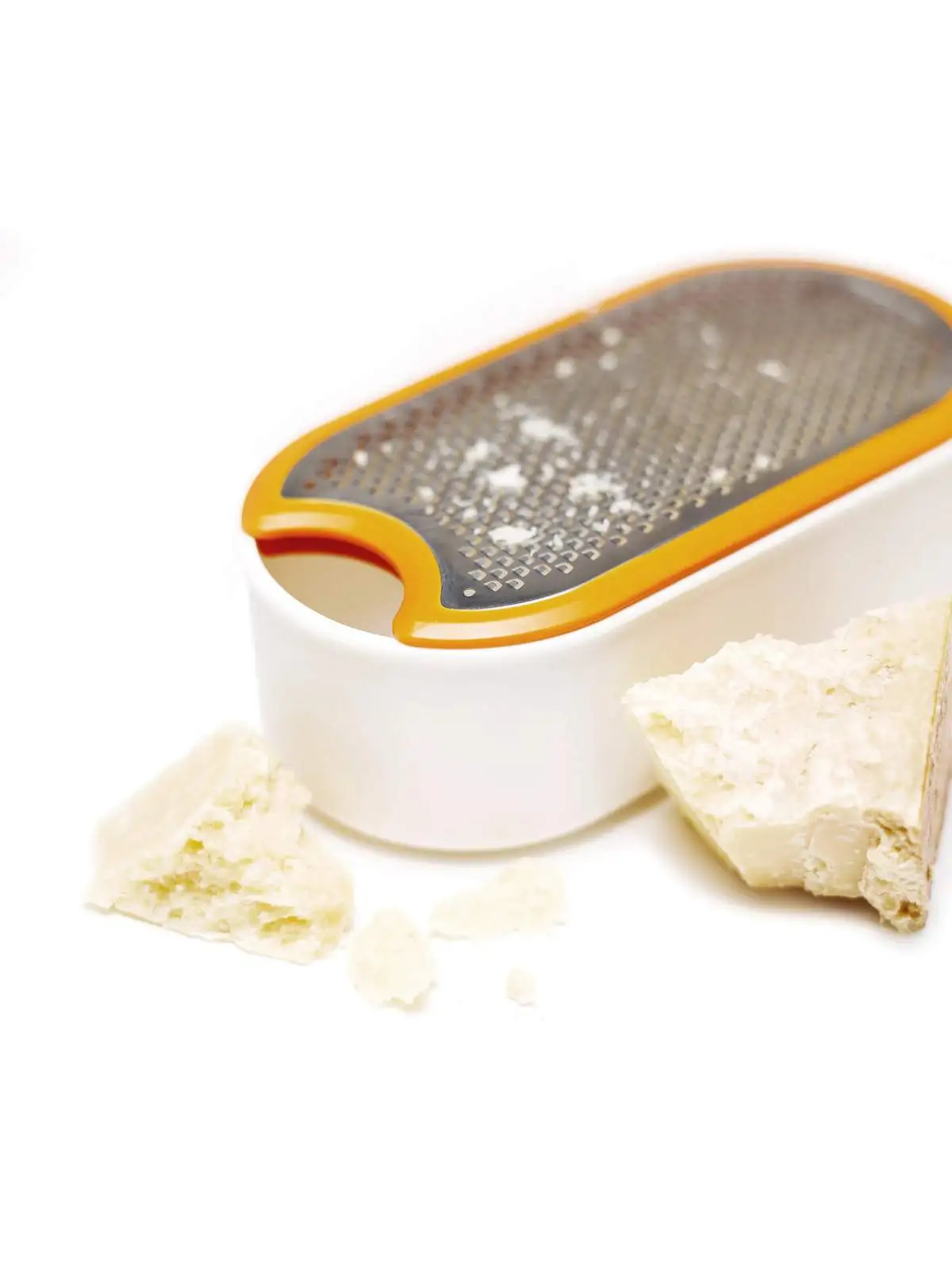 Smart rivejern med beholder til fx at rive parmesan. Med låget på kan det også bruges til at holde ingredienserne friske i køleskabet.