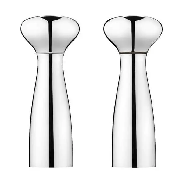 Stilfuldt Alfredo salt- og pebersæt i blankt stål fra Georg Jensen med all grind kværn.
