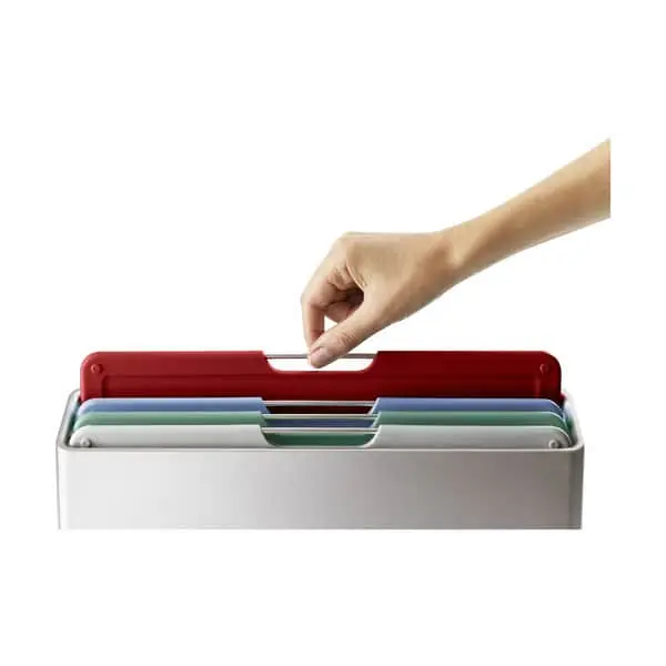 Hvert skærebræt har et smart håndtag, så du med et snuptag kan tage det op af kassen, der har en skrå åbning for nem adgang. Skridsikre fødder under kassen gør, at den står solidt på køkkenbordet. Nede i kassen står skærebrætterne adskilt, så luften kan cirkulere.