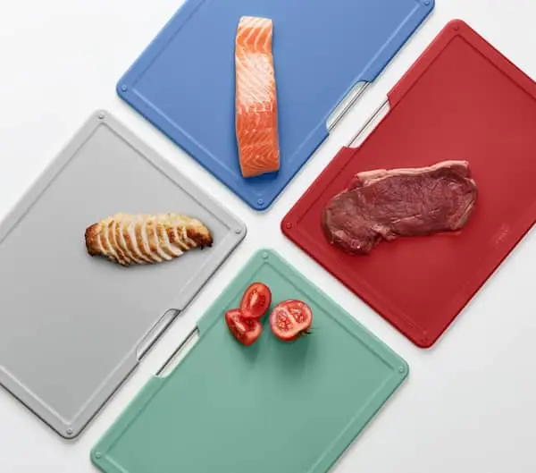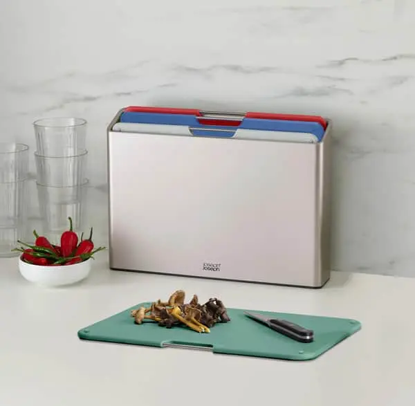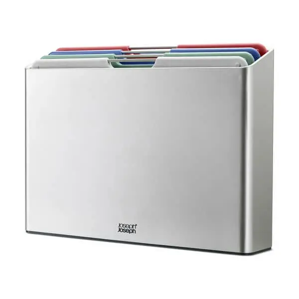 Hjælp den gode hygiejne og orden i køkkenet på vej med Folio skærebrætsættet fra Joseph Joseph. De 4 skærebrætter har hver deres farve, så du nemt kan skelne mellem, hvilket du bruger til at skære kød, grønt og brød på og holde madvarerne adskilt.