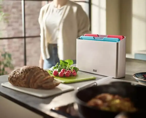 Hvert skærebræt har et smart håndtag, så du med et snuptag kan tage det op af kassen, der har en skrå åbning for nem adgang. Skridsikre fødder under kassen gør, at den står solidt på køkkenbordet. Nede i kassen står skærebrætterne adskilt, så luften kan cirkulere.