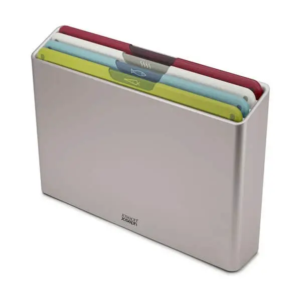 Hjælp den gode hygiejne og orden i køkkenet på vej med Folio skærebrætsættet fra Joseph Joseph. De 4 skærebrætter har hver deres farve, så du nemt kan skelne mellem, hvilket du bruger til at skære kød, grønt og brød på og holde madvarerne adskilt.