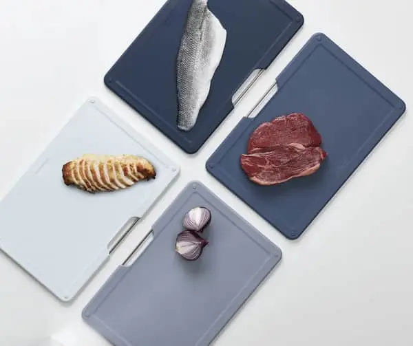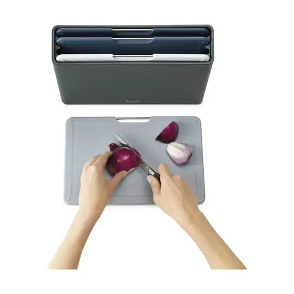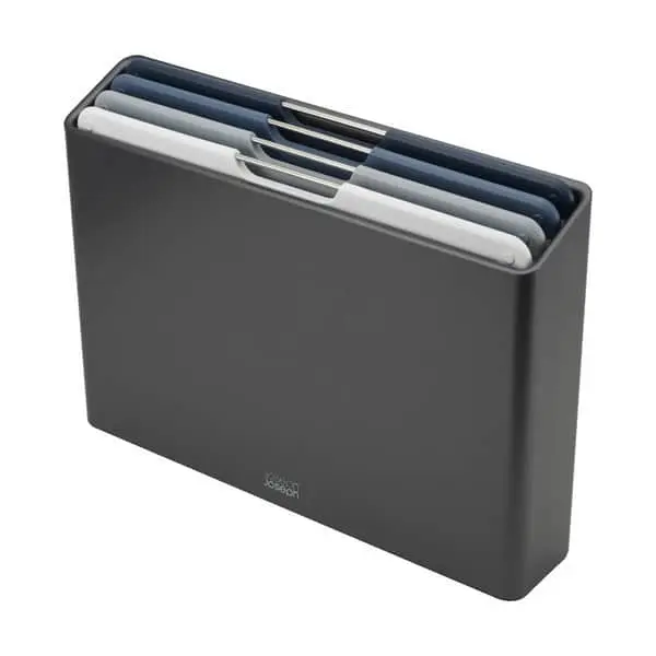 Hjælp den gode hygiejne og orden i køkkenet på vej med Folio skærebrætsættet fra Joseph Joseph. De 4 skærebrætter har hver deres farve, så du nemt kan skelne mellem, hvilket du bruger til at skære kød, grønt og brød på og holde madvarerne adskilt.