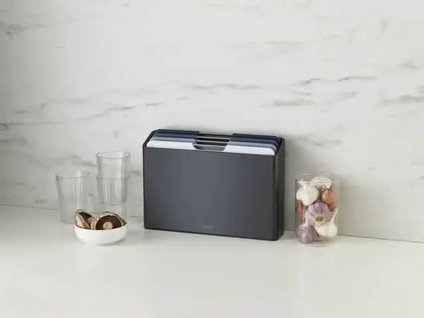 Hvert skærebræt har et smart håndtag, så du med et snuptag kan tage det op af kassen, der har en skrå åbning for nem adgang. Skridsikre fødder under kassen gør, at den står solidt på køkkenbordet. Nede i kassen står skærebrætterne adskilt, så luften kan cirkulere.