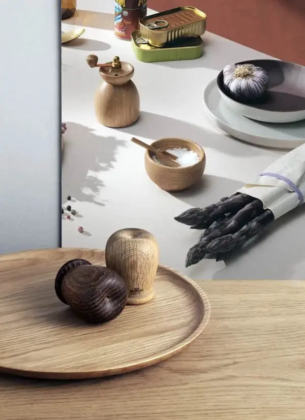 Stil salt- og peberkværnene fra Kay Bojesen Menageri på bordet. De er praktiske og smukke på samme tid. Hvert sæt har et unikt udtryk på grund af træets årer, der er forskellige fra sæt til sæt.