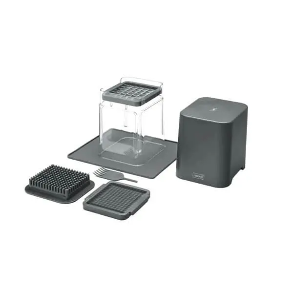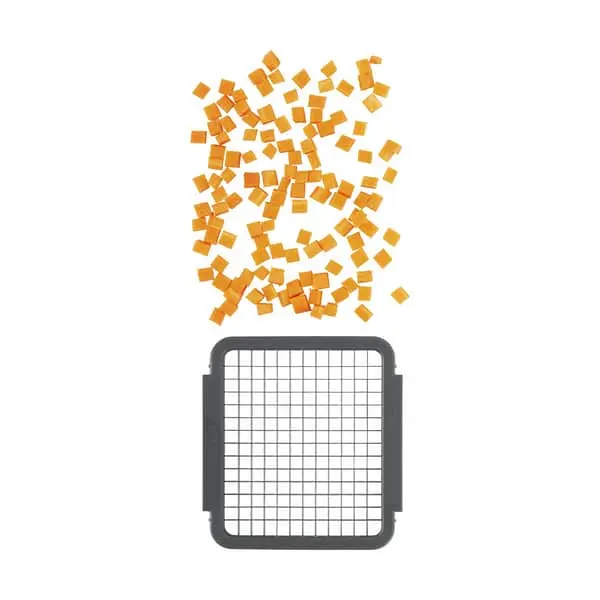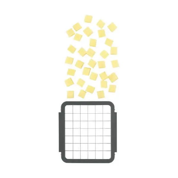 Med multiskæreren kan du hurtigt og nemt skære frugt og grøntsager i terninger eller staver. Sættet består af to skarpe knivindsatser til stave på 13 mm eller 6 mm kantlængde, samt en silikonemåtte for at beskytte køkkenbordet, når du bruger den.