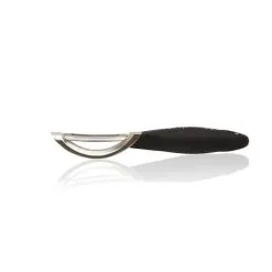 En ekstra skarp ven af køkkenet. Skræller hurtigt og tyndt med de skarpe blade og fjerner nemt ujævnheder med udhuleren i enden.