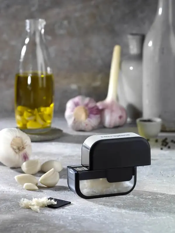 Microplane hvidløgsriver har en medfølgende skraber i låget, så du nemt kan flytte det friskrevne hvidløg fra beholderen.