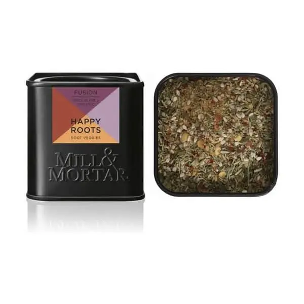 Happy Roots er en spændende økologisk krydderiblanding fra Mill & Mortar. Det er en urteblanding med fem forskellige urter ledsaget af en smule chili og sprød sesam.