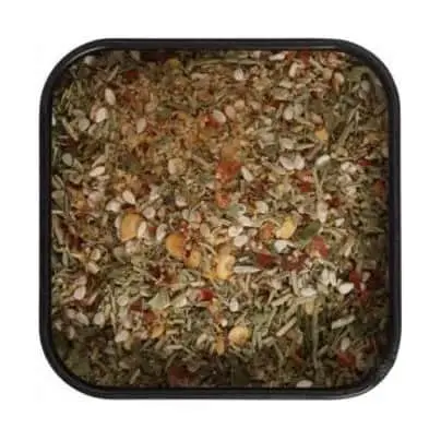 Hvidløgsgranulat*, rosmarin*, hvid sesam*, chiliflager*, sar*, oregano*, timian*, basilikum*.