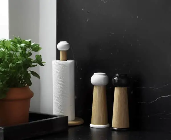 Køkkenelementerne i Barrel serien består af et buttet sæt salt- og peberbøsser, en køkkenrulleholder og salt- og peberkværnsæt. Alle elementerne pynter i køkkenet og på bordet.