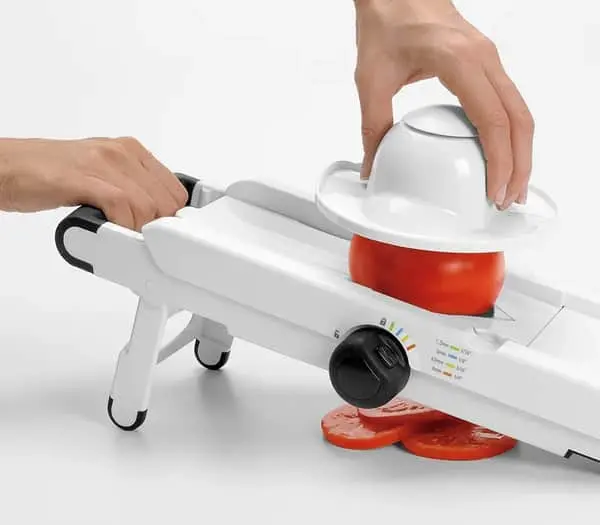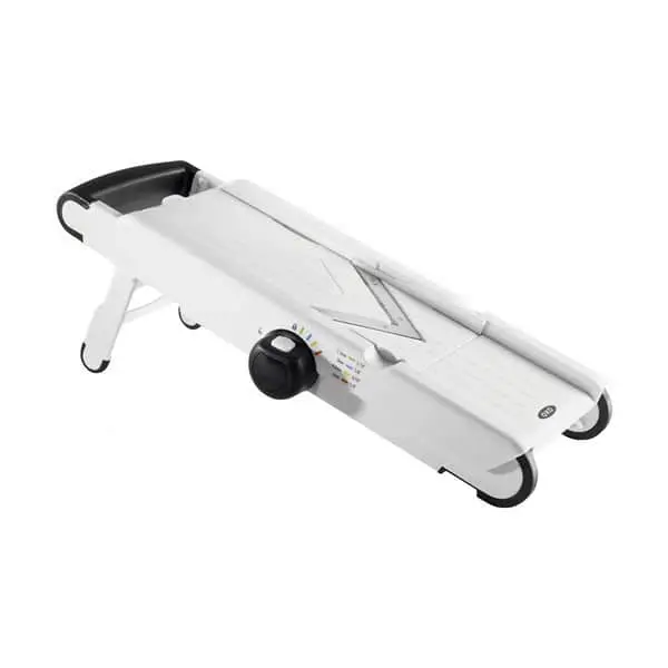Med OXOs mandolinjern Good Grips kan du på ingen tid snitte hjemmelavede pomfritter eller grøntsager til suppen og wokken. OXOs V-blad mandolinjern skærer både dine grøntsager og frugter, selv de bløde, såsom tomater, bliver skåret til perfektion uden at smatte.