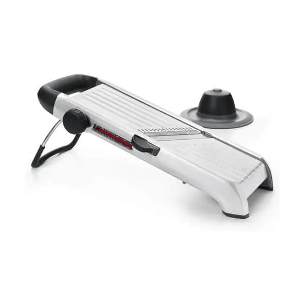 Med SteeL Chef’s mandolinjern fra OXO kan du nemt tilberede nogle spændende og dekorative retter med grøntsager og frugt. Mandolinjernet kan nemlig skære både lige og bølgede skiver, vaffelskiver, julienne-strimler og pommes frites.