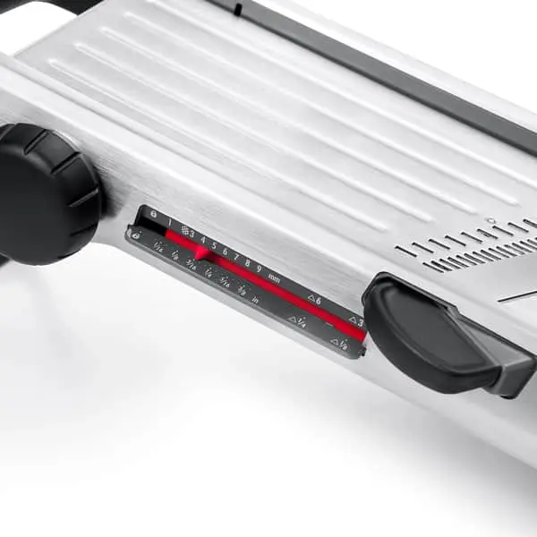 Mandolinjernet har et eksklusivt design i rustfrit stål. Det har et skarpt, skråt skær i japansk stål og kan finindstilles i hele 17 forskellige tykkelser fra 1 – 9 mm i intervaller på 0,5 mm. Indstillingen kan aflæses ovenfra og fra siden. Jernet har et tosidigt knivblad, som let kan skifte mellem lige og bølgede skiver. Skær til pommes frites og julienne-strimler er integreret og giver dig rigtig mange muligheder for at snitte, skære og rive.