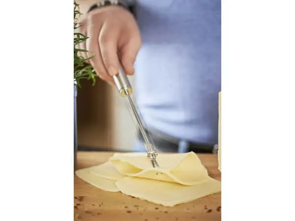 Rösle osteskæreren er ideel til at skære ost i forskellige tykkelser, da der findes to forskellige sider. Den er ganske nem at betjen for både højre- og venstrehåndede.