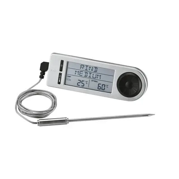 Stegetermometeret har to forskellige sensorer: en sensor, der måler temperaturen på kødet og en sensor, der måler grilltemperaturen. Måleområdet for stegetermometeret er -20 °C til +250 ° C, og sproget kan indstilles til tysk, engelsk eller fransk.