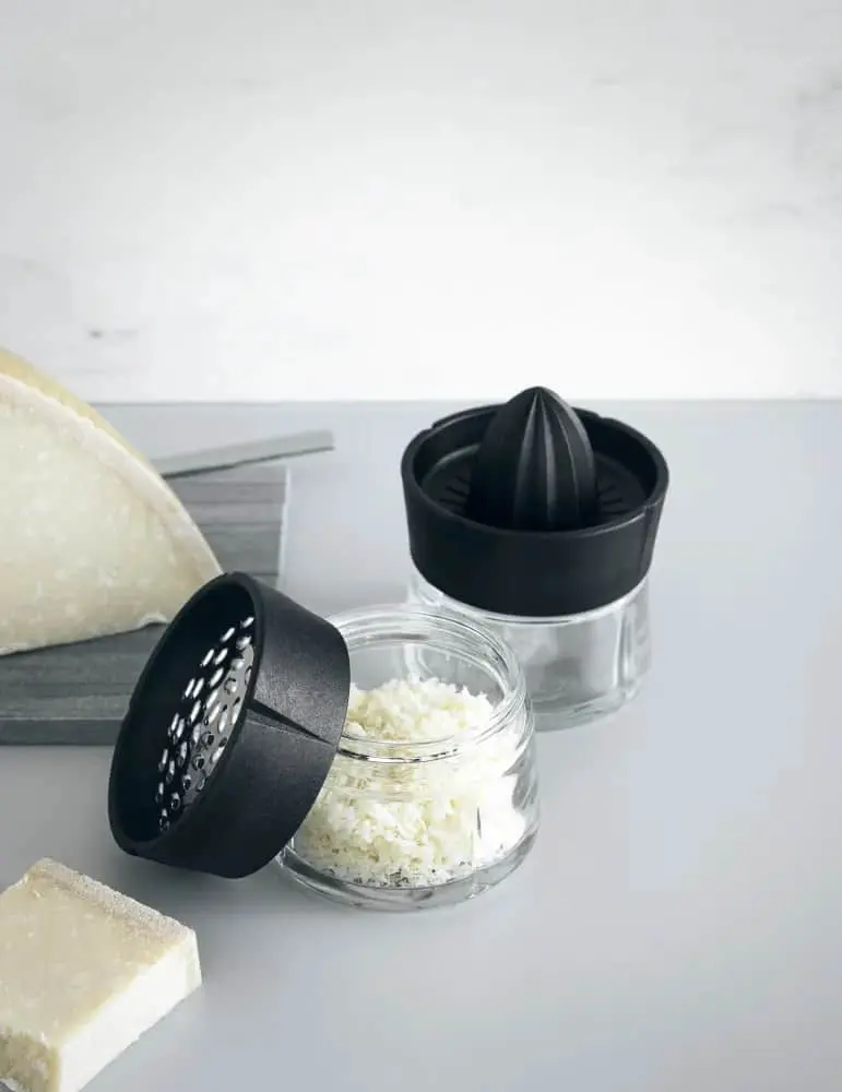 Rivejernets top har en høj kant og du river direkte ned i en smart opbevaringskrukke, så du mindsker spild og undgår citronrester på køkkenbordet.