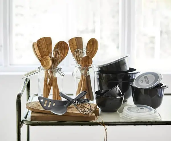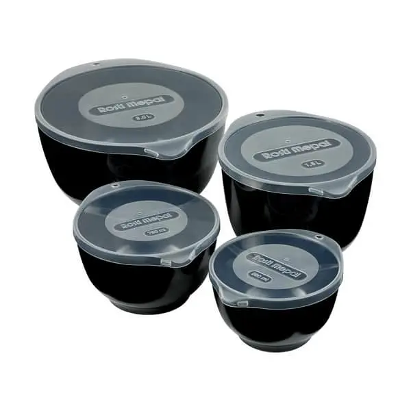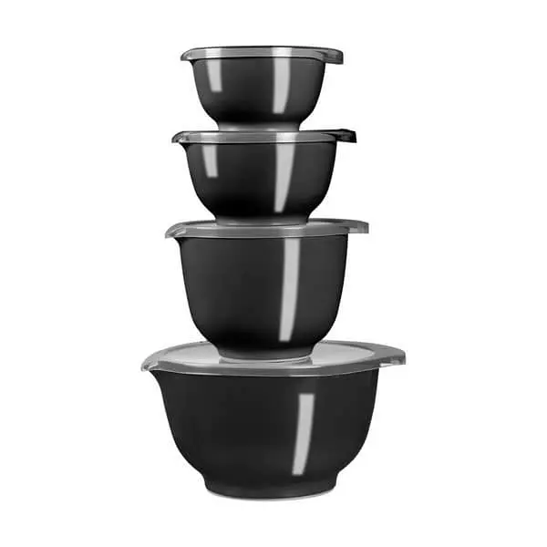 Her får du et sæt med fire sorte røreskåle, hver med et plastlåg. Skålene er udstyret med en skridsikker gummiring i bunden, så de står fast, mens du rører i dem. Og så er de gode til både madlavning og opbevaring.