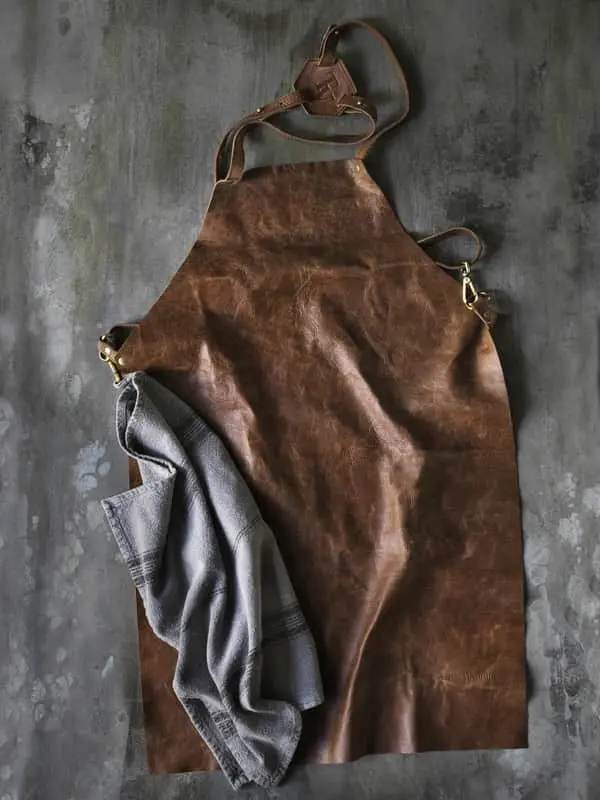 Forklædet fra Timm Vladimir Kitchen er fremstillet i et lækkert stykke bøffellæder. Hvert forklæde har sit eget unikke udtryk og vil ændre karakter i takt med sin alder – og kun til det smukkere. Der er kredset for detaljerne i designet med en karabinhage i siden, hvor du kan fastgøre et viskestykke. Og justerbare stropper så høj som lav kan få glæde af forklædet.
